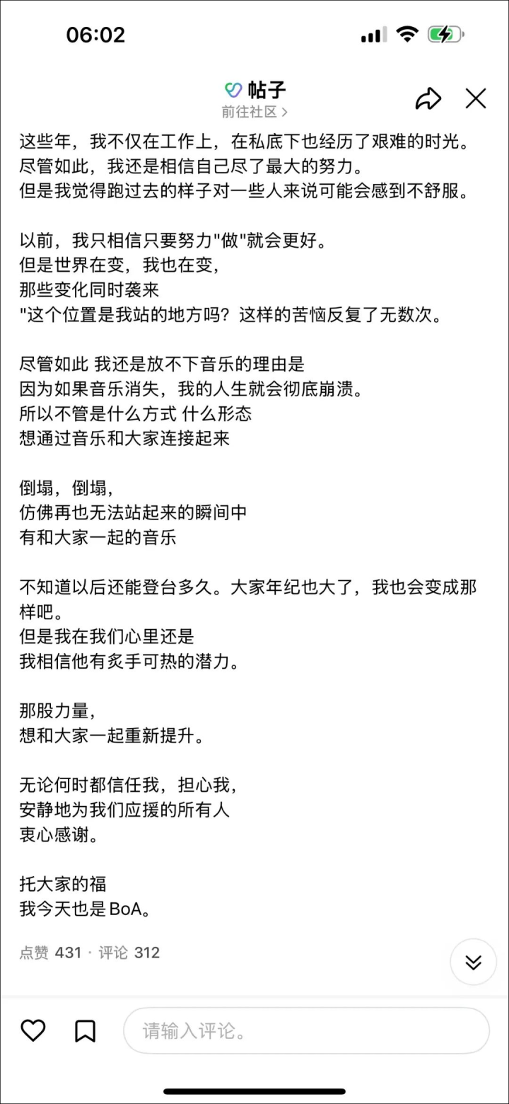 公司补充道:“BoA决定根据医生的建议进行手术,以防止病情进一步恶化,并避免剧烈的身体活动,尤其是舞蹈等表演。”因此,BoA原定于8月30日至31日在首尔蚕室室内体育馆举行的第五场个人演唱会将被取消。