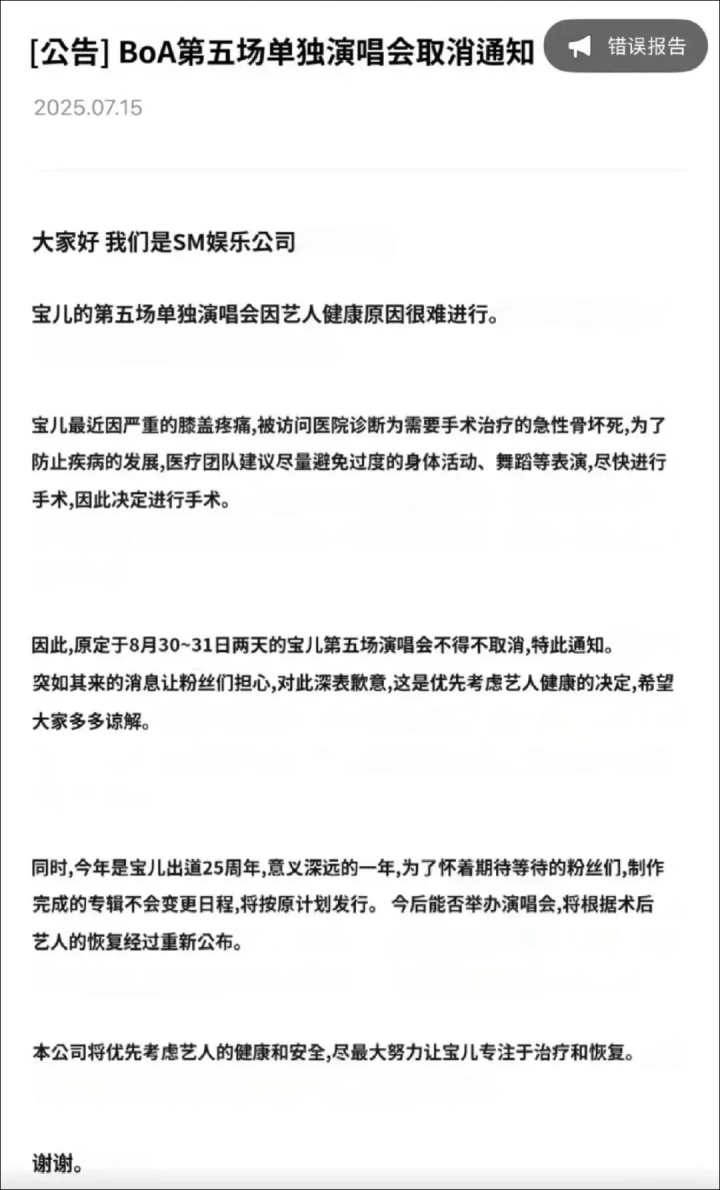 今天,韩国SM娱乐公司发布声明称,艺人BoA(宝儿)因近期膝部疼痛加重,前往医院检查后被确诊为急性骨坏死,需要进行手术治疗。